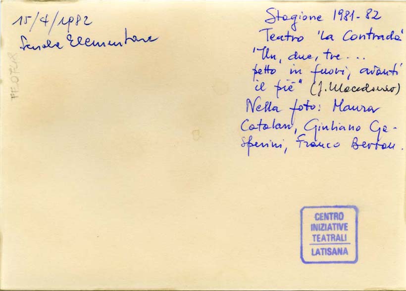 sul verso, in alto a destra: Stagione 1981/82/ Teatro "La Contrada"/ "Un, due, tre.../ petto in fuori, avanti/ il piè" (S. Macedonio)/ Nella foto: Maura/ Catalan, Giuliano Ga-/ sperini, Franco Bertan