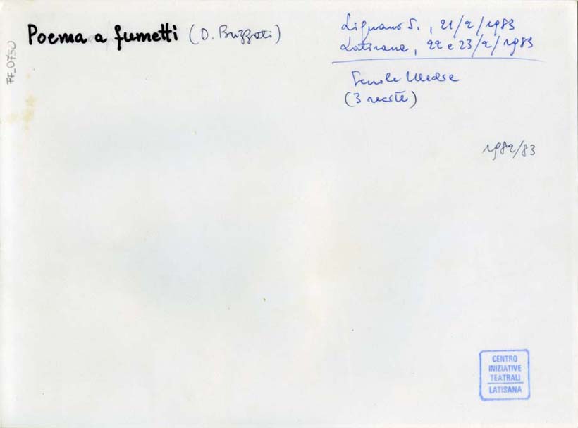 sul verso, in alto a destra: Lignano S., 21/2/1983/ Latisana, 22 e 23/2/1983/ scuole medie/ (3 recite)