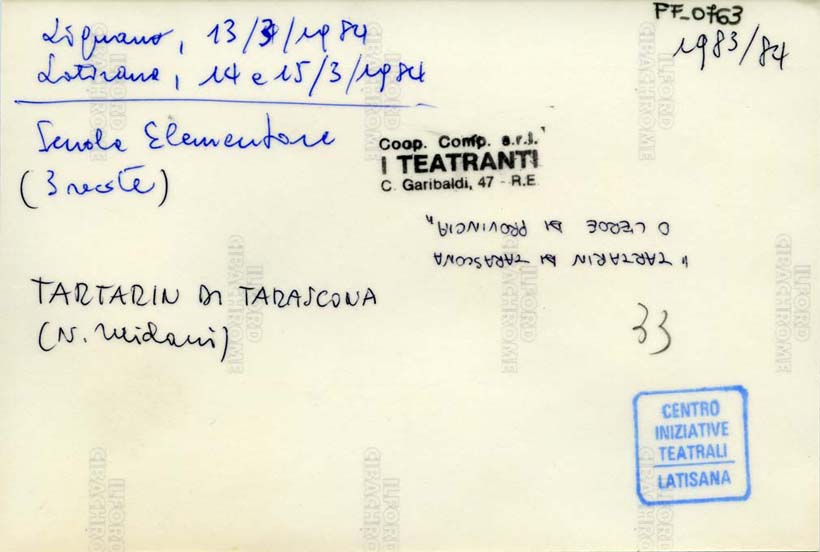 sul verso, in alto a sinistra: Lignano, 13/3/1984/ Latisana, 14 e 15/3/1984/ scuola elementare/ (3 recite)
