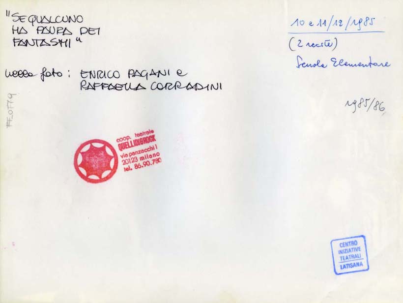 sul verso, in alto a destra: 10 e 11/12/1985/ (2 recite)/ Scuola Elementare/ 1985/86