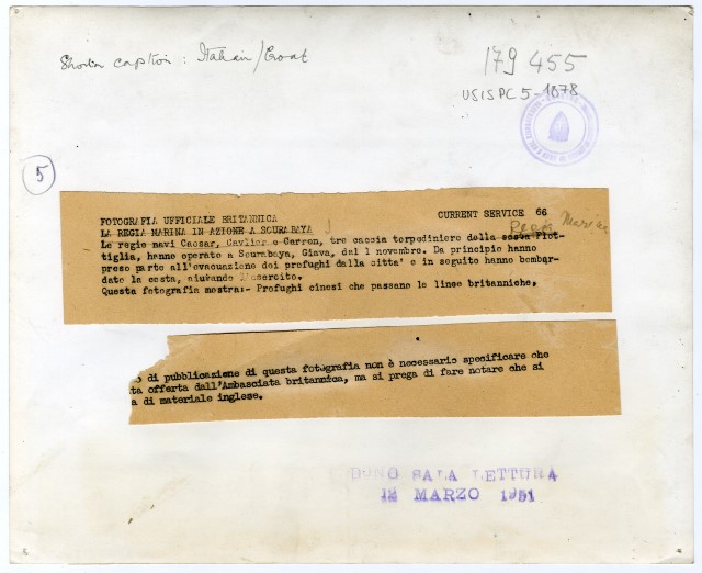 Sul verso del supporto primario, primo cartiglio : CURRENT SERVICE 66/ FOTOGRAFIA UFFICIALE BRITANNICA/ LA REGIA MARINA IN AZIONE A SOURABAYA/ Le regie navi Caesar, Cavlier e Carron, tre caccia torpediniere della sesta Flot-/ tiglia, hanno operato a Sourabaya, Giava, dal 1 novembre. Da principio hanno/ preso parte all'evacuazione dei profughi dalla città e in seguito hanno bombar-/ dato la costa, aiutando l'esercito./ Questa fotografia mostra:- Profughi cinesi che passano le linee britanniche.\pSul verso del supporto primario, secondo cartiglio : In aso di pubblicazione di questa fotografia non è necessario specificare che/ è stata offerta dall'Ambasciata britannica, ma si prega di fare notare che si/ tratta di materiale inglese.\pSul verso del supporto primario, a grafite : Shor(...) caption: Italian/Croat, 5\pSul recto del supporto primario, terzo cartiglio : 5. I tre cacciatorpedinieri della Re-/ gia Marina britannica, hanno operato a/ Surabaya, Giava, dal ! novembre. Da/ principio hanno preso parte all'evacu-/ azione dei profughi dalla città e in/ seguito hanno bombardato la costa, aiu-/tando l'esercito./ Tri torpedinjera britanske Kraljev-/ ske mornarice bili su u akciji u Su-/ rabaya, na Javi, pocevsi 1.novembra./ Najprije su evakuirali izbjeglice, a/ zatim su bombardirali obalu, pomazu-/ ci tako vojsku.