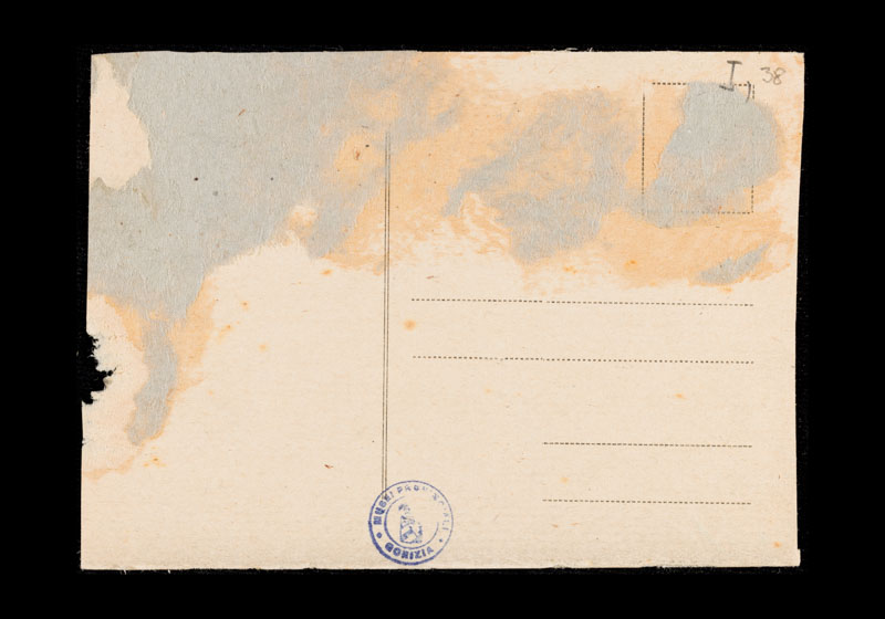 Le rovine del Seminario Minore Arcivescovile di Gorizia dopo i bombardamenti. Inaugurato nel 1912, il seminario venne utilizzato come ospedale della Croce Rossa austriaca dall’inizio del conflitto e fino all’agosto 1916. In primo piano si vede il rudere di una casa. Cartolina non viaggiata.