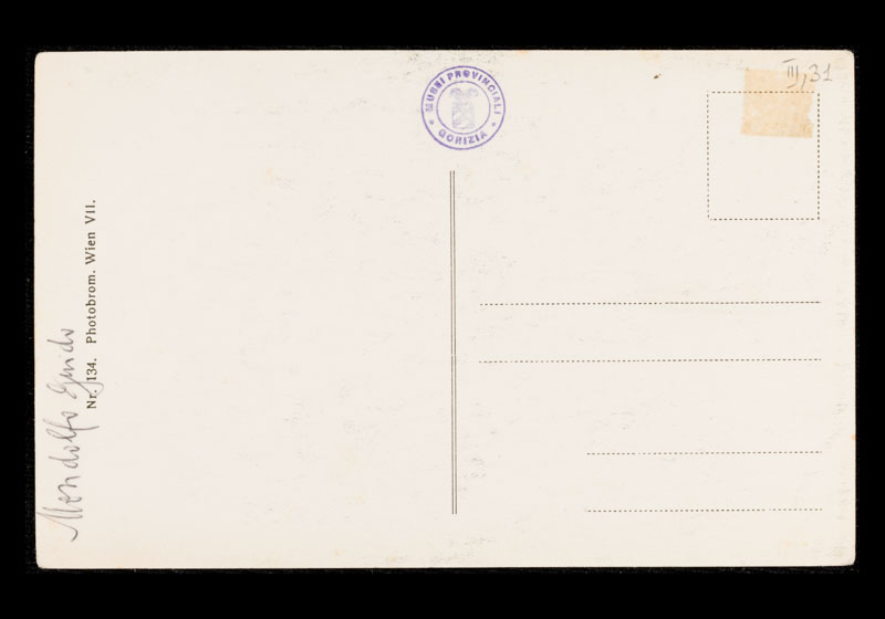 Primo piano di un edificio a Piuma, vicino a Gorizia, che riporta evidenti danni e crolli a seguito dei bombardamenti. Oltre l'edificio si scorge il campanile della chiesa di San Silvestro Papa. Cartolina non viaggiata.