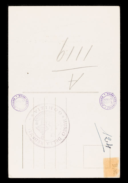 In primo piano un edificio in Via Morelli a Gorizia che presenta un profondo squarcio nella facciata, conseguenza di un attacco militare. Cartolina non viaggiata.