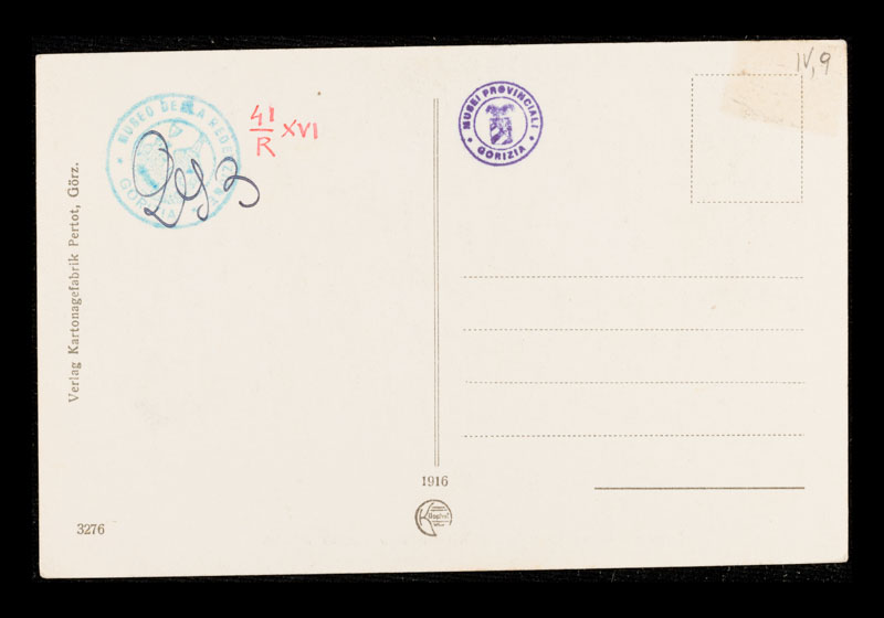 verso, in alto a sinistra. Iscrizione posta a destra del timbro Museo della Redenzione di Gorizia: 41/ _/ R/ XVI