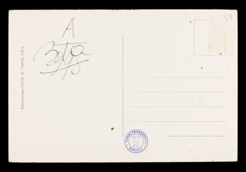 Frammenti di granate e shrapnel (proiettile per artiglieria largamente utilizzato durante la prima guerra mondiale) sparati dall'esercito italiano, raccolti e accatastati dopo il bombardamento di Gorizia. Cartolina non viaggiata.
