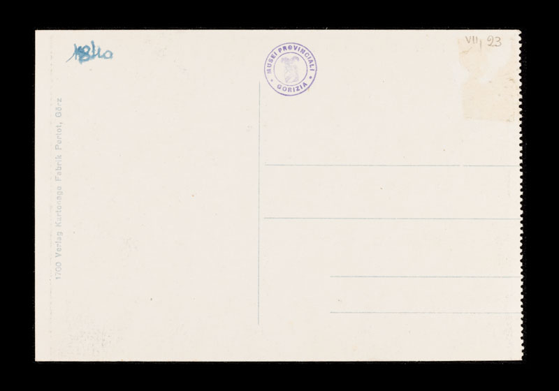 Veduta delle rovine di San Pietro di Gorizia (oggi località del comune di San Pietro-Vertoiba in Slovenia), che fu bombardata a più riprese tra il 1915 e il 1917. In primo piano un uomo seduto su un muretto guarda in lontananza. Alle sue spalle solo macerie. Cartolina non viaggiata. Bordo sinistro fustellato.