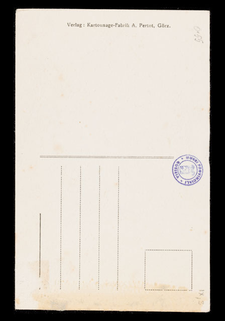 verso, lungo il bordo sinistro: Verlag: Kartonnage-Fabrik A. Pertot, Görz.