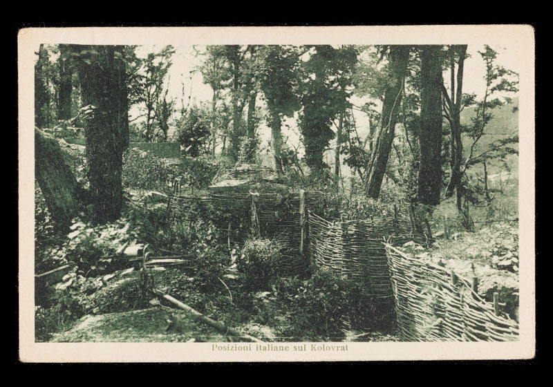 Sul monte Colovrat (Kolovrat), situato nell'estrema parte orientale del Friuli-Venezia Giulia al confine con la repubblica di Slovenia, l'esercito italiano stabilì delle posizioni nel corso della Prima guerra mondiale. Grazie al fitto bosco fu possibile un efficace mimetismo. Cartolina non viaggiata.