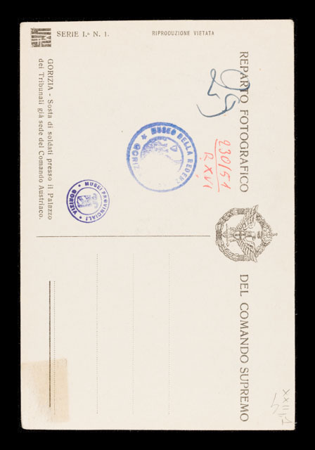 sul verso, in basso a sinistra: GORIZIA - Sosta di soldati presso il palazzo dei Tribunali [sic] già sede del Comando Austriaco