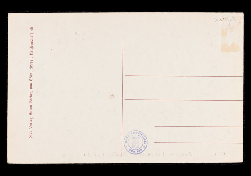 Veduta di un casa completamente devastata dai bombardamenti della Prima guerra mondiale, situata vicino alla Chiesa dei Santi Vito e Modesto nel borgo Piazzutta a Groizia. Cartolina non viaggiata.