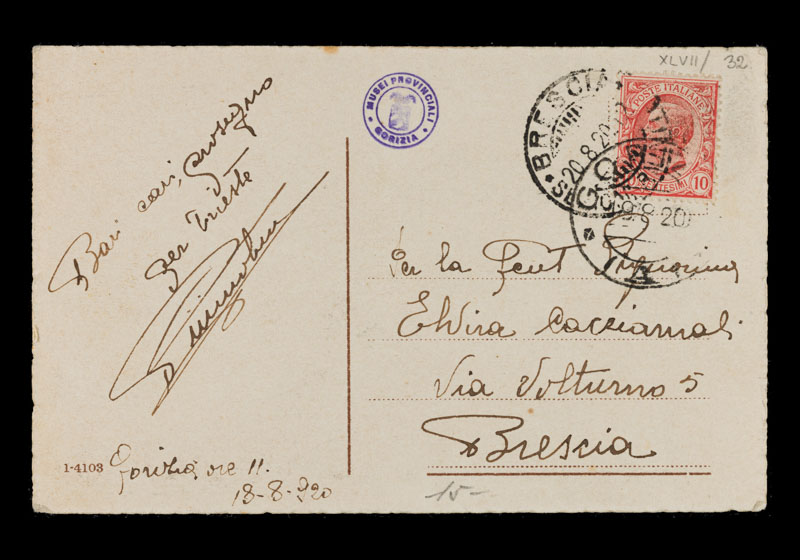 sul verso, su tutta la superficie: Baci cari, proseguo/ per Trieste/ [sic]/ Gorizia ore 11./ 18-8-920/ Per la Gent Signorina/ Elvira Cacriamali/ Via Volturno 5/ Brescia