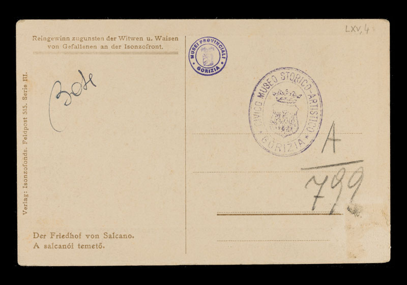 Il cimitero di Salcano ai piedi del Monte Sabotino. Una persona cammina tra le croci delle tombe con un mazzo di fiori tra le mani. Sul retro della cartolina è riportata, a stampa, la scritta "Utile netto a favore delle vedove e degli orfani dei caduti sul fronte isontino". Cartolina non viaggiata.