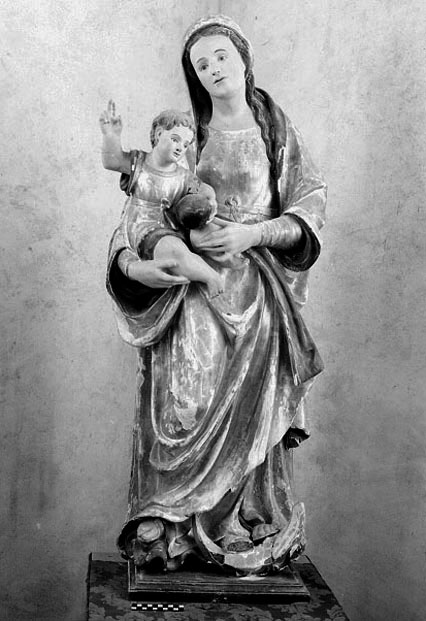 Il gruppo rappresenta la Vergine, stante, che poggia il piede sinistra su una falce di luna e regge il Bambino sul braccio destro. Entrambe le figur e portavesti dorate mentre il manto della Vergine è azzurro. Gli incarnati sembrano ridipinti. Le dorature presentano evidenti lacune della cromia.