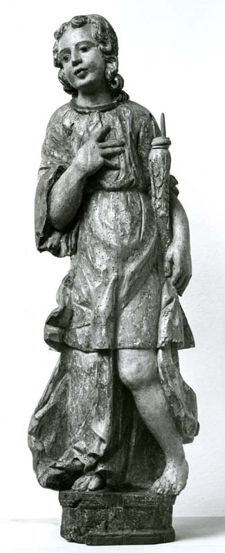 La statua rappresenta un angelo privo di ali, in posizione retta, con un'inclinazione del corpo verso sinistra. La mano destra è aperta sul petto, mentre quella sinistra trattiene al fianco un bastone portacero. L'ampia veste stretta in vita copre interamente la gamba destra, mentre lascia in parte scoperta quella sinistra evidenziandone così la torsione verso l'esterno. Il volto è trattato con una plastica molto morbida, tratto che si riversa anche nella fluida capigliatura.