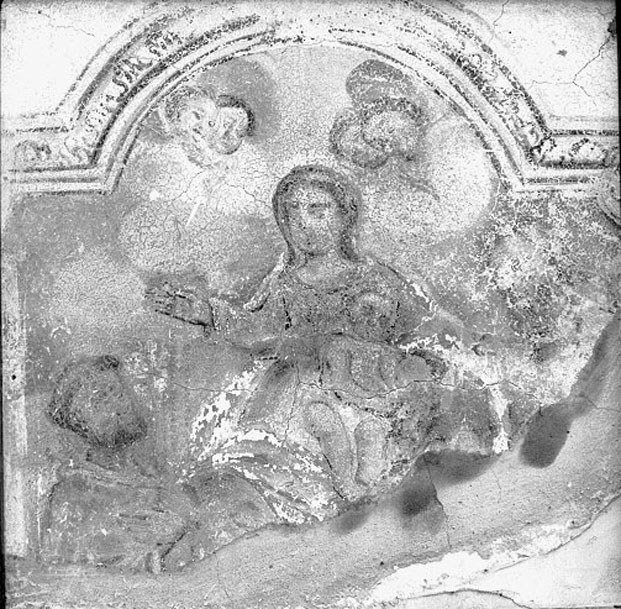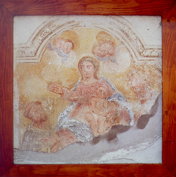 Il dipinto è racchiuso da una grossolana cornice in legno. Con i lavori di riadattamento della casa, lo stesso muratore ha stuccato, in malomodo, la parte bassa del dipinto. La Madonna, con il Bambino seduto sulle ginocchi a, porge con la mano dx il rosario. Ai lati i Ss.Antonio da PAdova e Giuse ppe. I colori sono sbiaditi; prevale la tonalità dell'ocra.