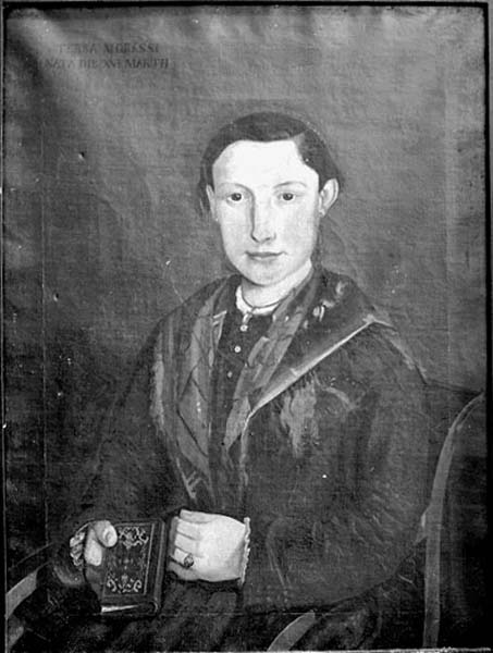 Teresa Morassi era moglie di Giovanni Iosio, il cui ritratto si conserva presso la stessa famiglia (scheda n. 26306). Personaggio piuttosto stravagante, era solita portare i capelli molto corti, come si rileva del resto dal ritratto e indossare un cappello a larghe tese simile a quello dei prelati. Il dipinto, datato 1861 e siglato D.D.V.P., può essere attribuito grazie alla sigla e attraverso l'analisi stilistica al pittore Domenico Di Vora attivo in Carnia e artefice dei ritratti di alcuni componenti della famiglia Bruseschi di Pesaris. Anche se il ritratto di Giovanni Josio non è firmato ne datato lo si può ritenere del medesimo autore.
