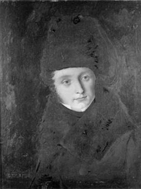 Ritratto di uomo a mezzo busto in abiti scuri, con il solo colletto della camicia bianca che esce leggermente dal collo di pelliccia. Indossa un colbacco anch'esso di pelliccia scura. Porta delle lunghe basette riccie.