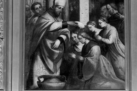 Le quattro vergini Tecla, Eufemia, Dorotea ed Erasma stanno inginocchiate davanti a Sant'Ermacora, in atto di versare l'acqua lustrale. Varie persone assistono al rito che si svolge all'interno di uno spoglio edificio.
