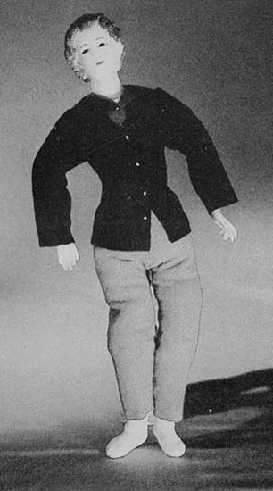 La statuetta presenta testa, collo, mani e piedi in cera, mentre il resto del corpo è realizzato in tela imbottita. L'abbigliamento è costituito da pantaloni, giacca, gilet. I pantaloni sono in panno di lana di colore bruno, non molto aderenti e lunghi sino alla caviglia. Della stessa qualità di panno è la giacca nera, aderente in vita e abbottonata da quattro perline bianche, con girocollo rotondo a punta sul davanti e maniche lunghe a giro, piuttosto ampie. Il gilet in panno di lana viola, con collo a punta, è chiuso da quattro minute perline di vetro, una delle quali recente. Al di sotto si intravvede il colletto della camicia, in tela di cotone bianca, fermato da un bottone. Calze bianche di cotone lavorate a macchina completano l'abbigliamento.