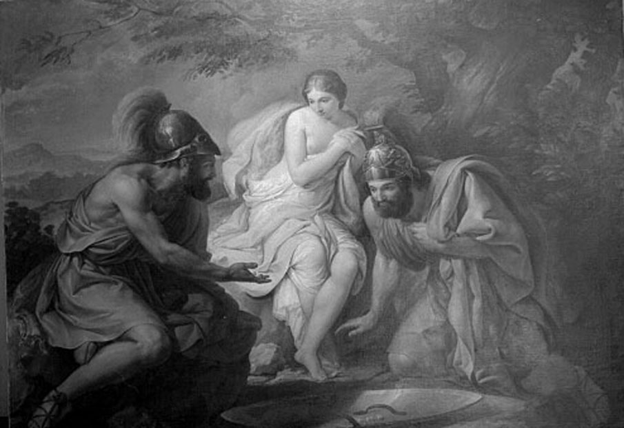 Il dipinto raffigura il momento in cui Teseo e Piritoo si giocano ai dadi Elena, dopo averla rapita.