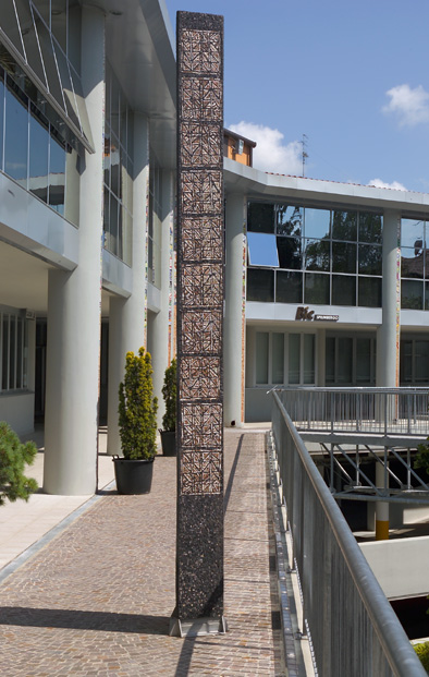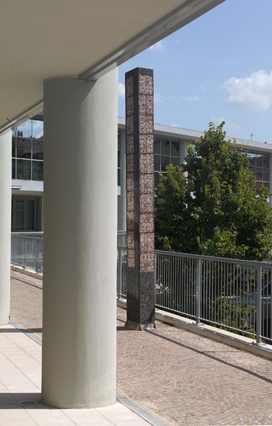 Stele trifacciale. Il mosaico è realizzato con tecnica diretta su supporto in vetroresina. Sono rappresentati dieci quadrati bianchi su sfondo nero.