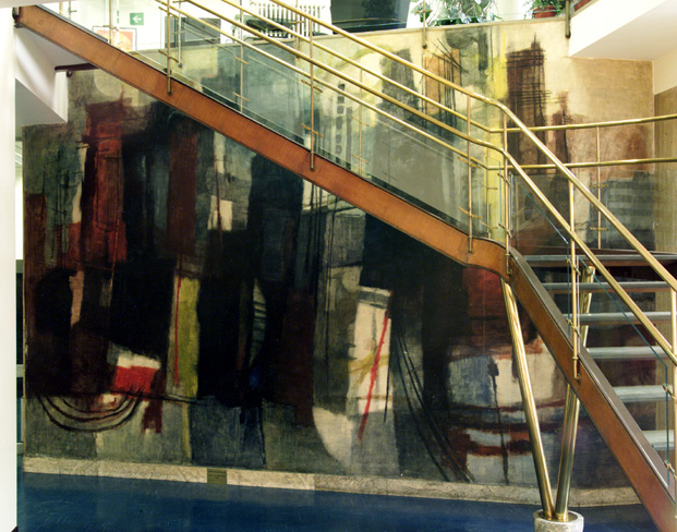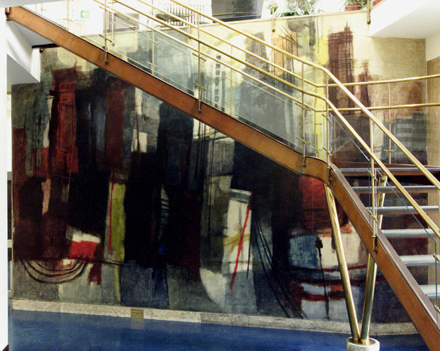 L'ultimo restauro dell'opera, concluso nel novembre del 2002, si è reso necessario per consolidare alcuni sollevamenti dell'imprimitura originale, alcune cadute di colore, varie abrasioni e soprattutto per rimuovere le sgocciolature di detergenti, causate dall'incauta pulitura del pavimento del piano superiore. La decorazione risulta dipinta su un intonaco a calce e sabbia (forse con l'aggiunta di gesso) sul quale è stesa una sottile rasatura di sola calce carbonatata, allo scopo di rendere più liscia la superficie pittorica. Sulla rasatura a calce è stata stesa una sottile imprimitura di bianco di zinco legato con una resina vinilica. Sopra questa imprimitura si nota un secondo strato a bianco con qualche sporadica particella carboniosa che determina la cromia. In questo strato si è notato anche la presenza di cariche silicatico-quarzose (forse vetro macinato molto finemente) ed una stesura organica a base di rosso d'uovo. Nei campioni analizzati, riguardanti tutta la superficie, si è individuata la presenza di cera, il che permette con tutta sicurezza di poter affermare che Afro non adottò la tecnica ad encausto. Si può afferma re piuttosto di una pittura vinilica, con una verniciatura ed alcune ripassature a tempera all'uovo. Il sistema di pulitura adottato, molto blando e controllabile, ha permesso di non pregiudicare le molte sottili velature e verniciature originali. L'integrazione pittorica delle lacune è stata eseguita con acquerelli della Windsor & Newton. L'opera è stata eseguita su autorizzazione della D.G. del 25.2.1955 Serv. Finanz. Patr.n. 2651. © Centro Regionale di Catalogazione e Restauro dei Beni Culturali