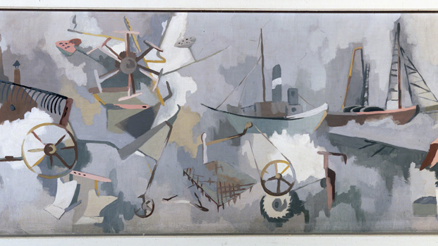 Allegoria del lavoro: architetture, tralicci, macchine, cantieri.
