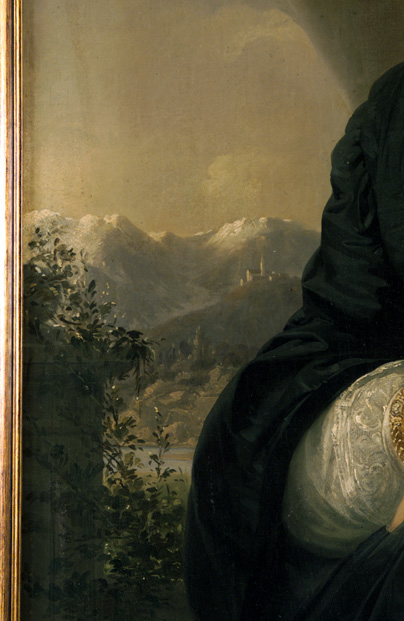 Angelina Vianello è raffigurata frontalmente, con una veste di raso nero dalle ampie maniche e colletto bianco di pizzo. Le mani sono conserte in grembo e l'indice della destra tiene il segno tra le pagine di un piccolo libricino. La pettinatura ha scriminatura centrale, è bassa e i capelli sono di colore nero. Alle orecchie si notano due piccoli orecchini. Sullo sfondo a destra si nota la colonna di un grande palazzo e un pesante tendone rosso, mentre sulla sinistra, dietro un parapetto circondato dall'edera, è rappresentato un paesaggio montano.