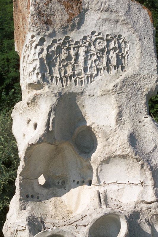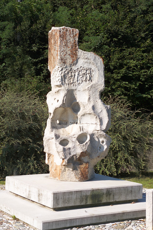 L'opera si presenta come una forma irregolare, corrosa e scalfita, con delle zone concave dove, in alcuni casi la materia è asportata generando dei fori nel blocco di pietra. Sulla superficie sono visibili dei lacerti figurativi: del filo spinato e nella zona centrale una truppa di soldati raffigurati in modo sommario e ridotto.