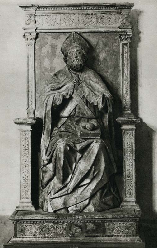 La scultura è l'unica opera documentata di Bartolomeo dall'Occhio. Fra il 1502 e il 1505 egli risulta infatti impegnato nell'intaglio di un'opera commissionata dai camerari della chiesa delle Sante Maria e Giuliana di Castello (cfr. Metz, op. cit., 2000, p. 388). Notizie documentarie riferiscono che un'incoronazione di San Nicolò ad opera di Bartolomeo per la stessa chiesa è ultimata nel 1503, ma non è certo si tratti della stessa scultura. La figura di Nicolò, ora mutila delle mani un tempo impegnate, una a reggere il pastorale, l'altra in un gesto bendedicente, dimostra un'impostazione volumetrica ormai compiutamente rinascimentale (Cfr. F. Dell'Agnese, Museo Civico, 2001, p. 80). A Marchetti e Nicoletti si deve la supposizione che l'opera comprendesse in origine anche le figure di due angeli che incoronavano il Santo, richiamando così il coevo esemplare iconogrfico del S.Nicolò nell'altare a sportelli di Dreikirchen.