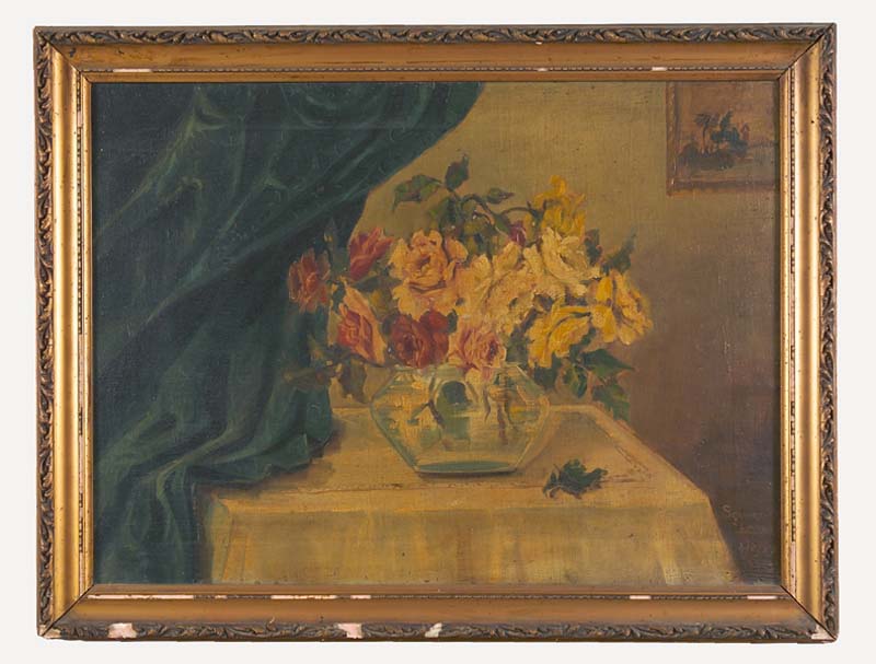 Vaso di rose su un tavolo, con drappo verde e quadretto di paesaggio appeso a parete. Dipinto con cornice molto rovinata.