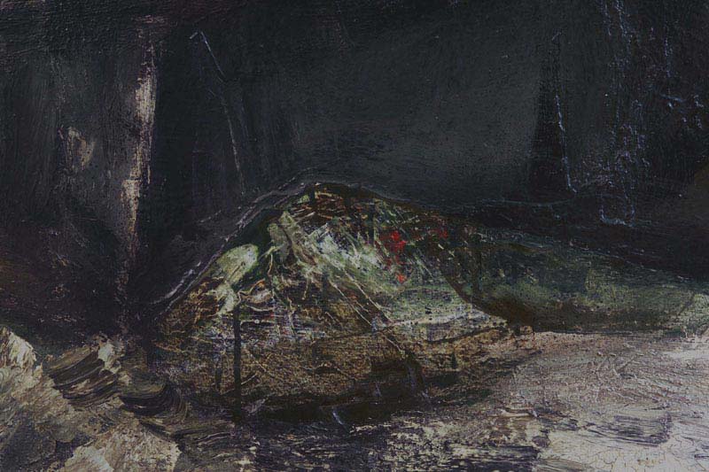 Quasi come in un astrazione il paesaggio carsico è fatto di rocce e scarni arbusti con macchie di colore, arancione, verde, ma soprattutto bianco. Dipinto con cornice senza vetro.