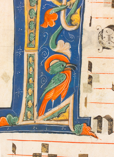Iniziale decorata L: Locutus [...]. Campo blu filettato di bianco. Corpo lettera variopinto decorato a motivi vegetali. Interno lettera decorato da un intreccio di tralci in cui è inserito un uccello stilizzato; un altro uccello conclude il fregio esternamente al campo.
