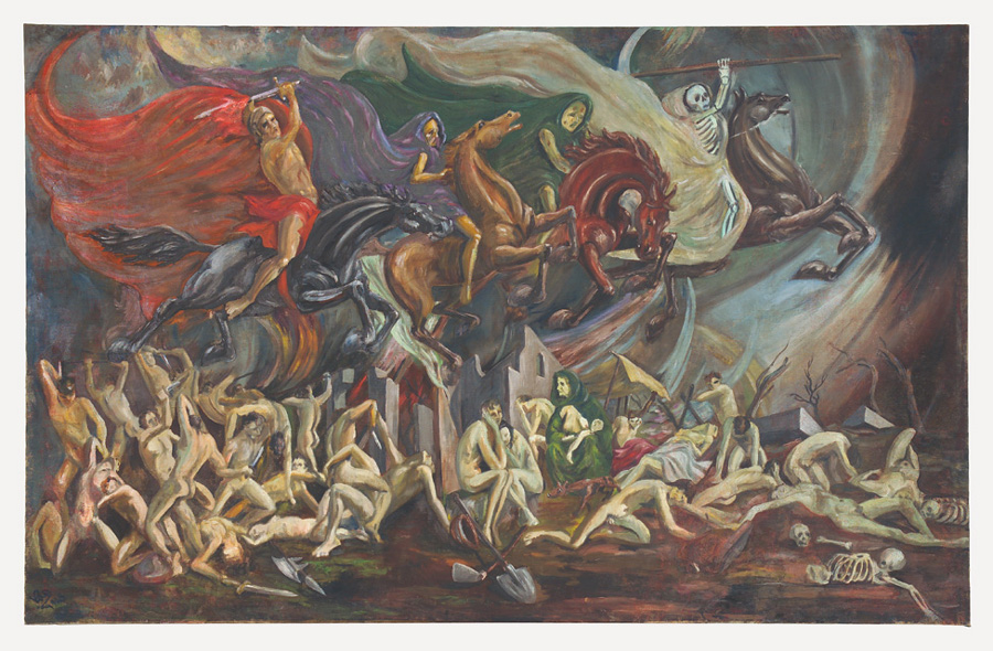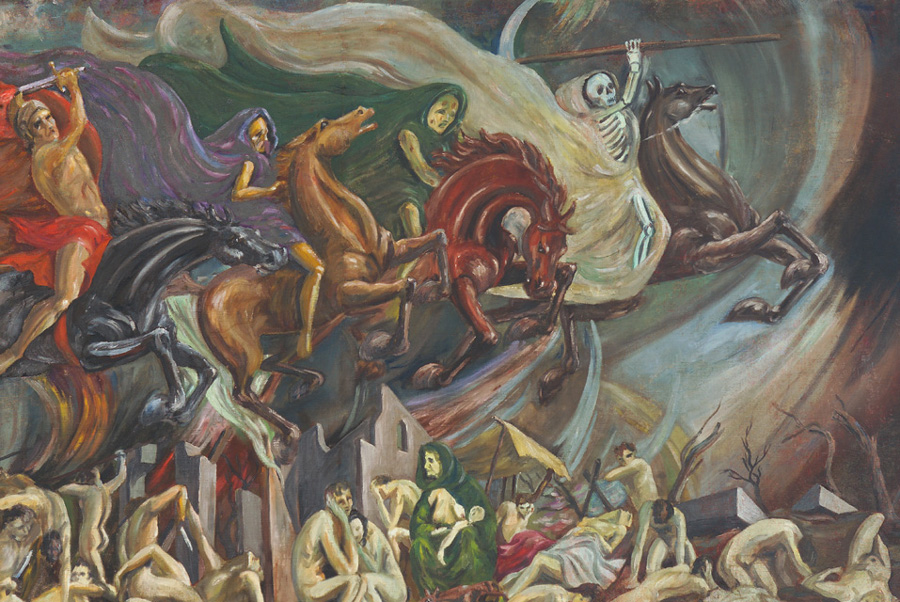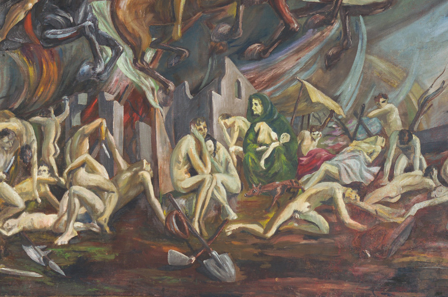 Il dipinto, appartenente a una serie di quattro tele che rappresentano temi analoghi (la peste, la fame, la guerra), è stato eseguito da Vitaliano Parussini, come attestato dalla firma e dalla data apposti sulla tela. La scelta del tema si inquadra nel momento storico immediatamente successivo alla conclusione del secondo conflitto mondiale e probabilmente venne suggerito all'autore dall'esperienza vissuta nella resistenza partigiana. Alla vitalità dei cavalli, condotti da cupe figure di morte (dei quattro cavalieri, uno brandisce la spada, un altro la falce), fa riscontro il dramma di un'umanità travolta e calpestata dai flagelli rappresentati dai cavalieri stessi: la guerra, il dominatore, la fame, la morte.