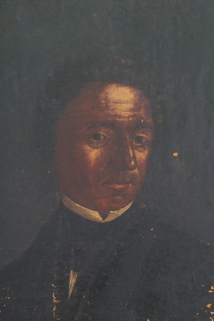 Il ritratto del religioso è campito entro un ovale. L'uomo è raffigurato a busto intero, presso un tavolo, rivolto verso sinistra, con il capo atteggiato dalla parte opposta e lo sguardo diretto a colui che guarda. L'uomo appoggia il dorso della mano sinistra sul fianco, mentre il braccio destro è posato al tavolo, con la mano aperta a indicare sè medesimo. Egli veste una camicia bianca dal colletto alto, che lambisce il volto, chiusa da una grande cravatta nera annodata al collo, che si intravede sotto il gilet e la giacca nera, dall'ampio bavero. L'uomo ha il capo coperto da una cuffia nera che lascia intravedere ciocche di capelli castani sulla fronte e sulle tempie. Sul tavolo giace un cartiglio iscritto, un calamaio provvisto di una penna d'oca e dei libri.