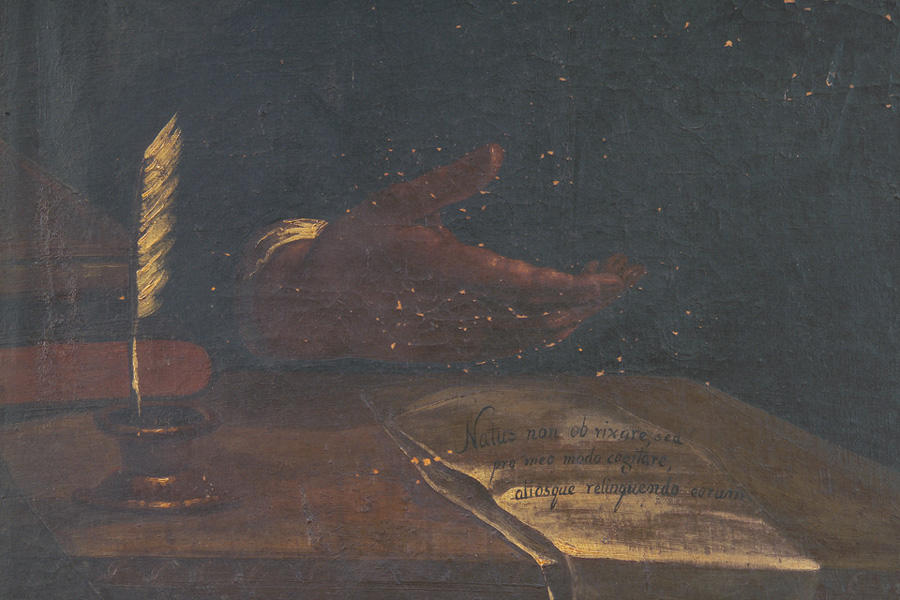 in basso al centro, entro cartiglio: Natus non ob rixare,/ sed pro meo modo cogitare,/ aliosque reliquendo eorum