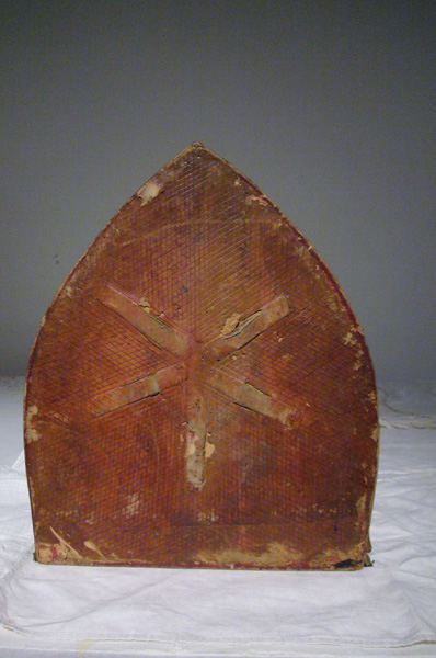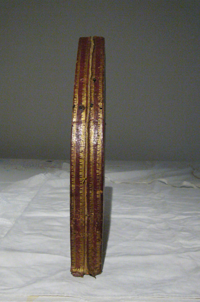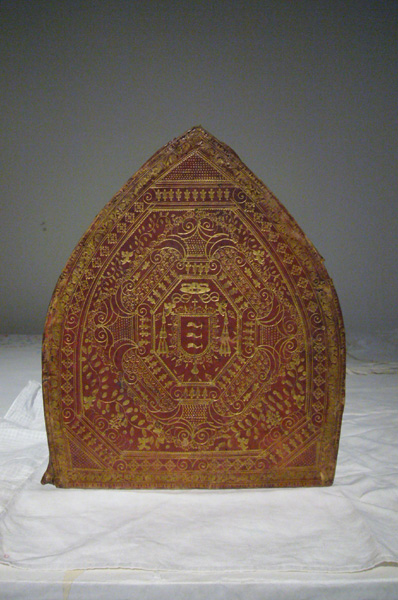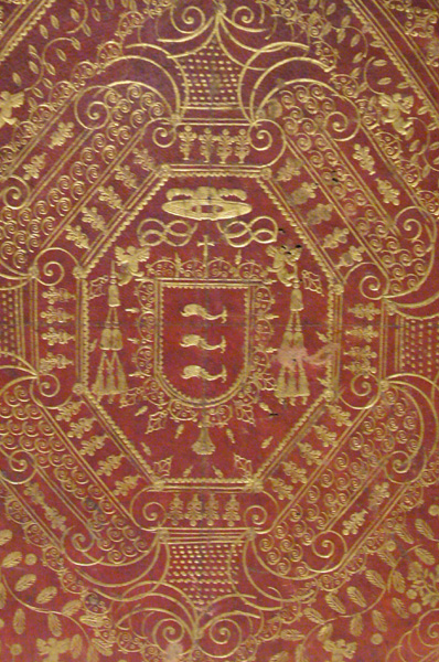 La custodia, che presenta la forma funzionale all'oggetto, è decorata da una serie di motivi impressi a tutto campo in oro su fondo rosso che nella disposizione scandiscono attraverso cornici a motivi geometrici e aree decorate con piccoli elementi florealvegetali, lo spazio centrale cui è apposto lo stemma dei patriarchi Delfino.