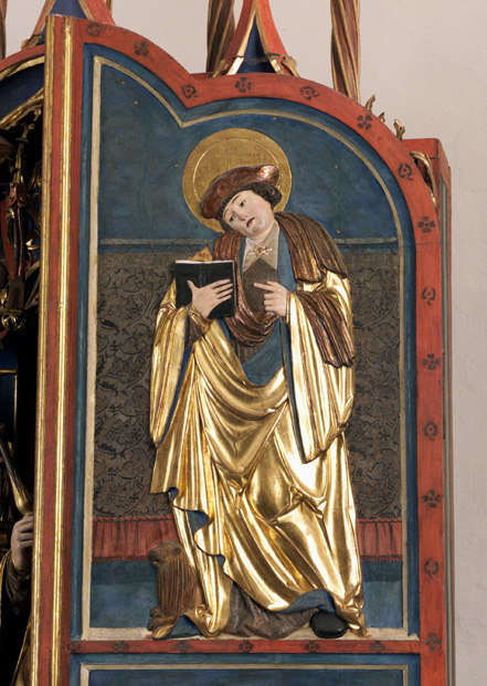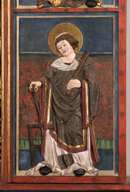 Lo sportello, lobato superiormente, è suddiviso in due campiture che ospitano i rilievi di San Girolamo, in alto, e San Lorenzo, in basso. Il primo sorregge con la mano destra un libro aperto verso cui indica con l'indice sinistro; ai suoi piedi è accucciato mansueto il leone. Lorenzo, in abiti diaconali, stringe nella mano sinistra la palma del martirio e sorregge con l'altra la graticola che ne fu lo strumento. Lo sfondo è chiuso da un prezioso drappo fissato a una barra, oltre il quale si scorge il cielo, stellato nel registro superiore.