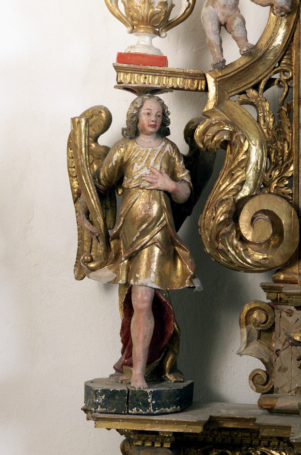 L'angelo, stante, ad ali spiegate, reca nella mano destra un candelabro a cornucopia e porta l'altra al petto. La figura indossa una sopravveste lunga fino a metà coscia sopra una veste che scende fino ai piedi, lasciando scoperta parte della gamba destra portata in avanti.
