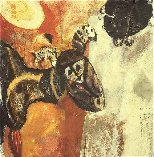 La parte centrale del dipinto è occupata da una capra stilizzata la quale si trova presumibilmente su di un carro di cui possiamo vedere in basso a sinistra la ruota; per un terzo lo sfondo è di colore bianco avente in alto un elemento circolare di colore nero, per i restanti due terzi lo sfondo è di colore principalmente arancione.