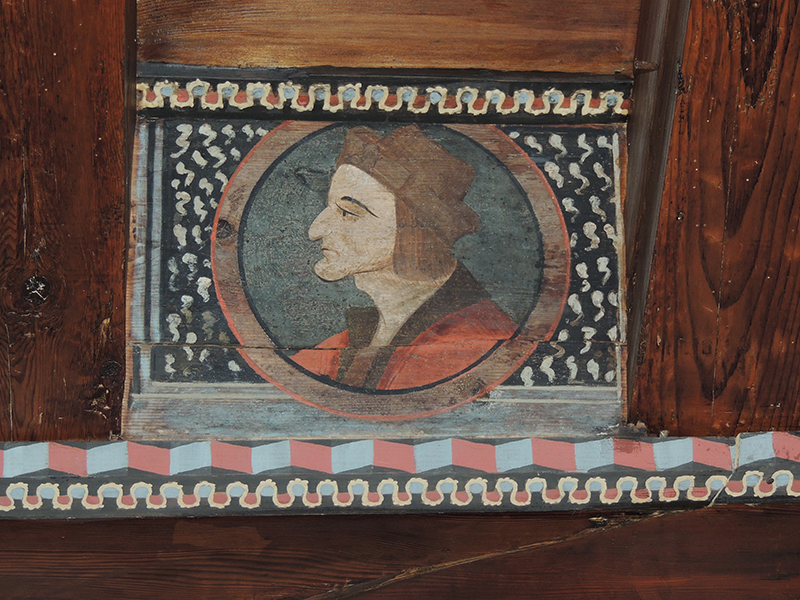 Tavoletta da soffitto realizzata in legno di abete, dipinta a tempera direttamente sul supporto privo di preparazione, ma semplicemente impermeabilizzato con una stesura di colla probabilmente di origine animale. All'interno di una semplice cornice rettangolare è presente un busto maschile di profilo inserito in un clipeo costituito da una semplice circonferenza.