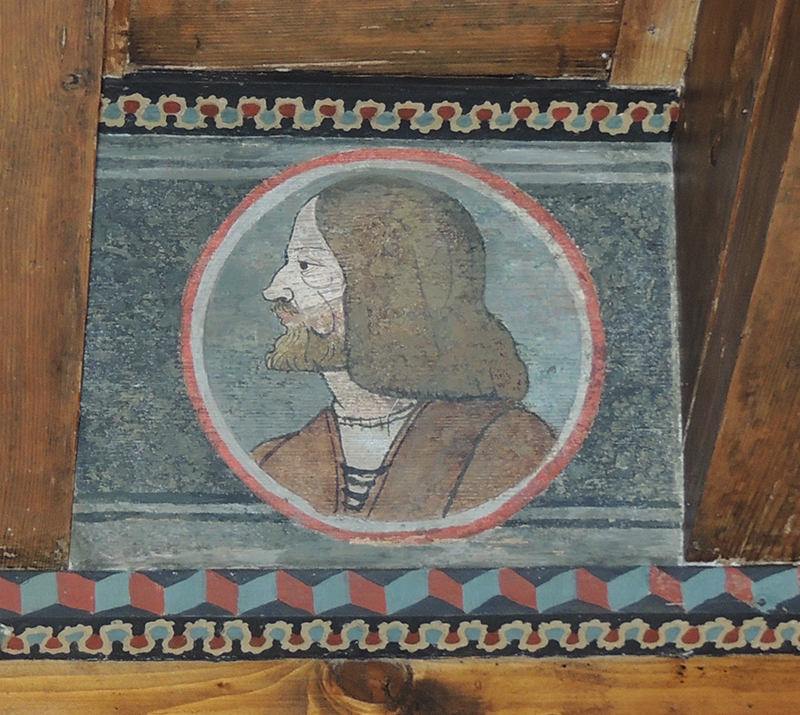 Tavoletta da soffitto realizzata in legno di abete, dipinta a tempera direttamente sul supporto privo di preparazione, ma semplicemente impermeabilizzato con una stesura di colla probabilmente di origine animale. All'interno di una semplice cornice rettangolare è presente un busto maschile di profilo su fondo azzurro inserito in un clipeo costituito da una semplice circonferenza.
