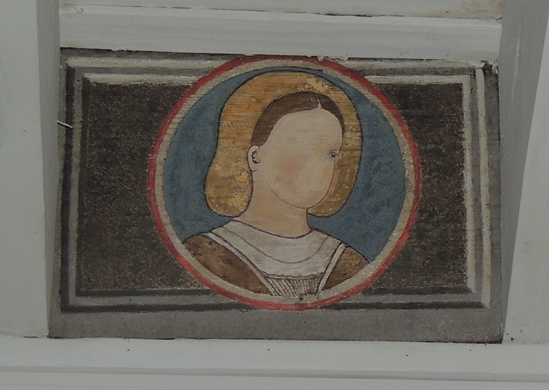 Tavoletta da soffitto realizzata in legno di abete, dipinta a tempera direttamente sul supporto privo di preparazione, ma semplicemente impermeabilizzato con una stesura di colla probabilmente di origine animale. All'interno di una semplice cornice rettangolare è presente un busto femminile di tre quarti nel quale mancano i dettagli del viso su fondo azzurro inserito in un clipeo costituito da una semplice circonferenza.