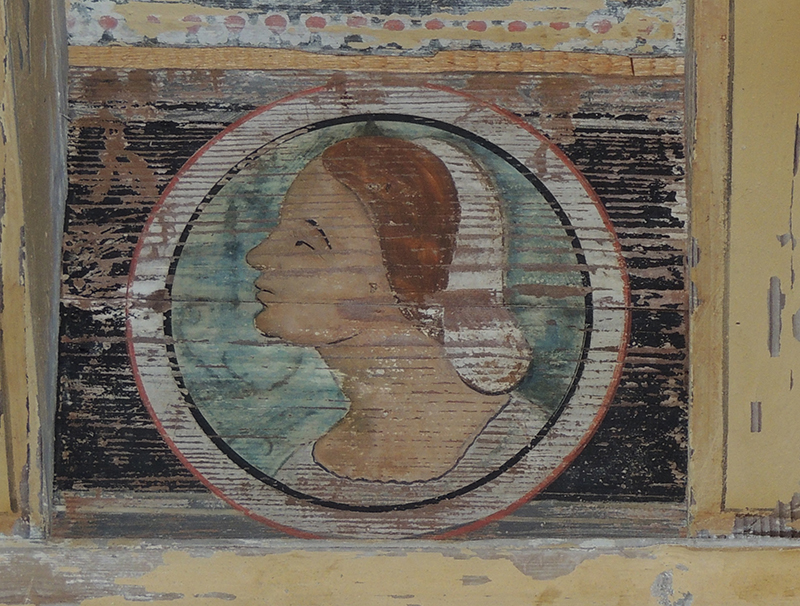 Tavoletta da soffitto realizzata in legno di abete, dipinta a tempera direttamente sul supporto privo di preparazione, ma semplicemente impermeabilizzato con una stesura di colla probabilmente di origine animale. All'interno di una semplice cornice rettangolare è presente un busto femminile di profilo su fondo azzurro inserito in un clipeo costituito da una semplice circonferenza.