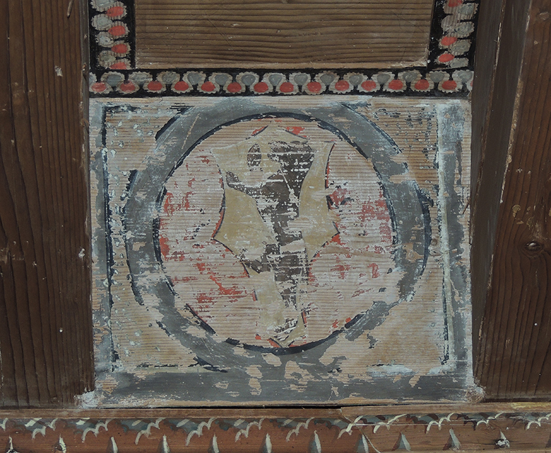 Tavoletta da soffitto realizzata in legno di abete, dipinta a tempera direttamente sul supporto privo di preparazione, ma semplicemente impermeabilizzato con una stesura di colla probabilmente di origine animale. All'interno di una semplice cornice rettangolare è presente lo stemma Valvasone su scudo 'a testa di cavallo' inserito in un clipeo costituito da una semplice circonferenza.