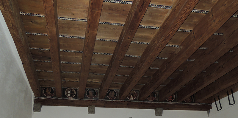 Il soffitto orna un ambiente al primo piano di palazzo Andriotti (oggi sede della Biblioteca civica Vicenzo Joppi). Nel medesimo edificio sono presenti altri quattro soffitti: uno di questi, posto nell’ambiente corrispettivo al piano superiore, presenta una decorazione del tutto omogenea. Pettenelle e cantinelle sono in buono stato di conservazione. Su un totale di 18 tavolette 2 sono prive di decorazione in quanto sostituite. Lo spazio dipinto è circoscritto da una cornice rettangolare al cui interno, su un fondo che imita una superficie lapidea, sono presenti ritratti (10) su fondo azzurro e stemmi (6) su fondo ocra, circoscritti da un clipeo semplice e lineare realizzato a compasso e costituito da due fasce, rossa quella esterna e bianca quella interna. Per quanto riguarda gli stemmi, uno non è stato identificato, mentre gli altri fanno riferimento ai Brazzà e agli Andriotti. I busti rappresentano uomini e donne, giovani e anziani, quasi tutti di profilo o di tre quarti e rivolti sia a destra sia a sinistra, tranne in un caso ripreso frontalmente.