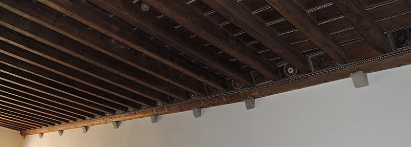Si tratta di un soffitto costituito da 48 pettenelle dipinte che orna un ambiente al secondo piano di palazzo Andriotti (oggi sede della Biblioteca civica Vicenzo Joppi). Lo spazio dipinto è circoscritto da una cornice rettangolare al cui interno, su un fondo che imita una superficie lapidea, sono presenti sirene e mascheroni vegetali, trofei d’armi, vasi ornamentali e stemmi (24). Questi ultimi sono inseriti in scudi ‘alla veneta’ posti su un fondo ocra e circoscritti da un clipeo semplice e lineare realizzato a compasso e costituito da due fasce, rossa quella esterna e bianca quella interna. Gli stemmi fanno riferimento ai Brazzà, Arcoloniani, de Simeonibus, della Torre e Andriotti.