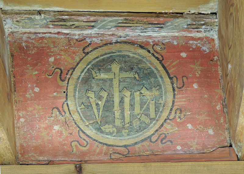 Tavoletta da soffitto realizzata in legno di abete, dipinta a tempera direttamente sul supporto privo di preparazione, ma semplicemente impermeabilizzato con una stesura di colla probabilmente di origine animale. La decorazione è costituita dall'emblema bernardiniano posto su un fondo rosso.