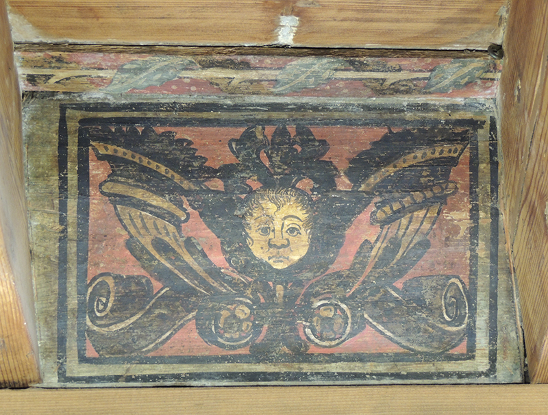 Tavoletta da soffitto realizzata in legno di abete, dipinta a tempera direttamente sul supporto privo di preparazione, ma semplicemente impermeabilizzato con una stesura di colla probabilmente di origine animale. All'interno di una cornice rettangolare e su fondo rosso è dipinta una decorazione costituita da una testa di cherubino con ali affiancata da due cornucopie.